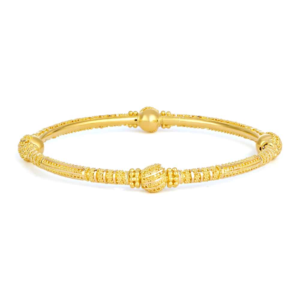 مصنوعة يدوياً من مادة صلبة 22 قيراط ويتميز الكادا المصنوع من الذهب بزخارف سطحية مشغولة بعناية تضفي عمقاً مع الحفاظ على مظهره الأنيق. تم تشطيب كل قطعة بلمسة نهائية من الذهب الناعم المتوهج المشعّ، وكل قطعة تحمل علامة مميزة في المملكة المتحدة للحصول على شهادة نقاء، مما يعكس التزام PureJewels بالدقة والأصالة.
