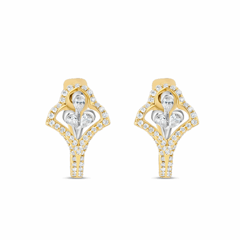 صُممت هذه المنتجات بأناقة لا مثيل لها. أقراط دائرية من الذهب عيار 18 قيراطاً من الألماس على شكل أزهار مزيج متناغم من التصميم التقليدي والمعاصر. تم إثراء الشكل الدائري المفتوح الأنيق بعنقود من الألماس على شكل زهرة في الوسط، وتحيط به أحجار ألماس مرصعة بالترصيع المرصوف الذي ينساب على طول الحواف في منحنى لطيف.