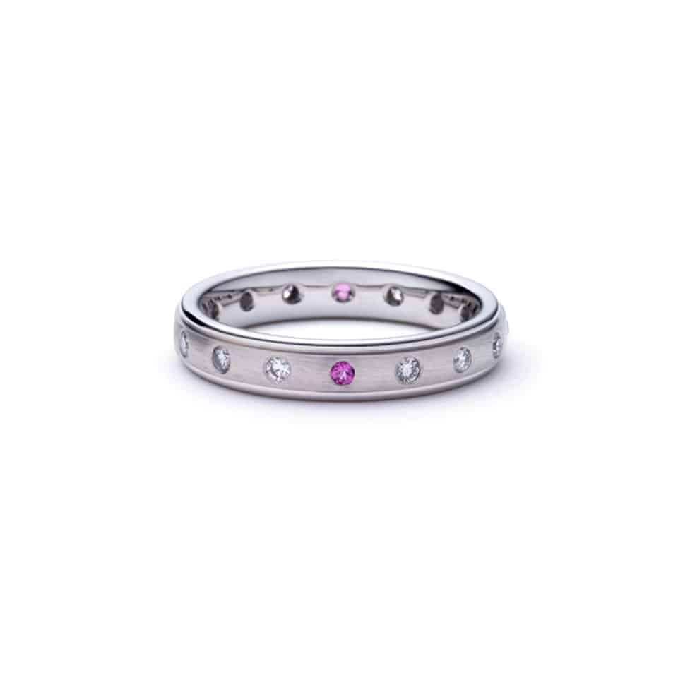 احتفل بالأناقة الخالدة مع خاتم الزواج البلاتيني البلاتيني من براون ونيويرث الذي يُعد رمزاً حقيقياً للحب الدائم والحرفية الراقية. صُنع هذا الخاتم يدوياً من البلاتين الفاخر، وهو مرصع بترتيب جميل من الألماس الأبيض ولمسة رقيقة من الياقوت الوردي لإضفاء لمسة عصرية على التقاليد.