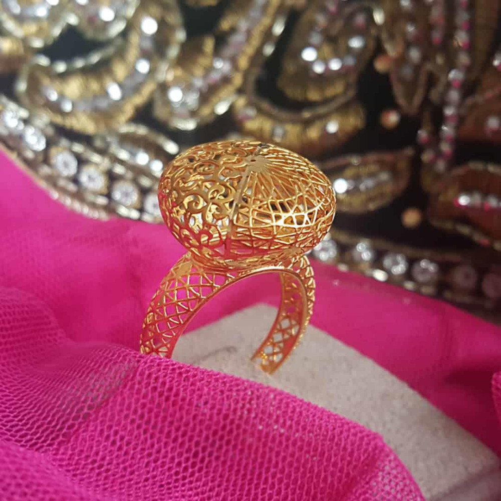 يجسّد هذا الخاتم المميز جوهر الصياغة التقليدية للذهب مع قبة كبيرة ومعقدة مصممة بنمط شبكي مزخرف مذهل. ويعكس السوار هذا النمط المزخرف، مما يخلق قطعة متناغمة وفاخرة.