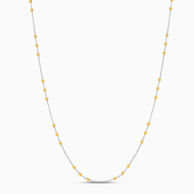 سلسلة صندوقية راقية من الذهب عيار 22 قيراطًا مزينة بالخرز الرقيق ومزينة بطلاء الروديوم لإضفاء أناقة رقيقة مزدوجة اللون. صُممت هذه القطعة بطول 18 بوصة لتضفي أناقة لا يحدها الزمن للارتداء اليومي.