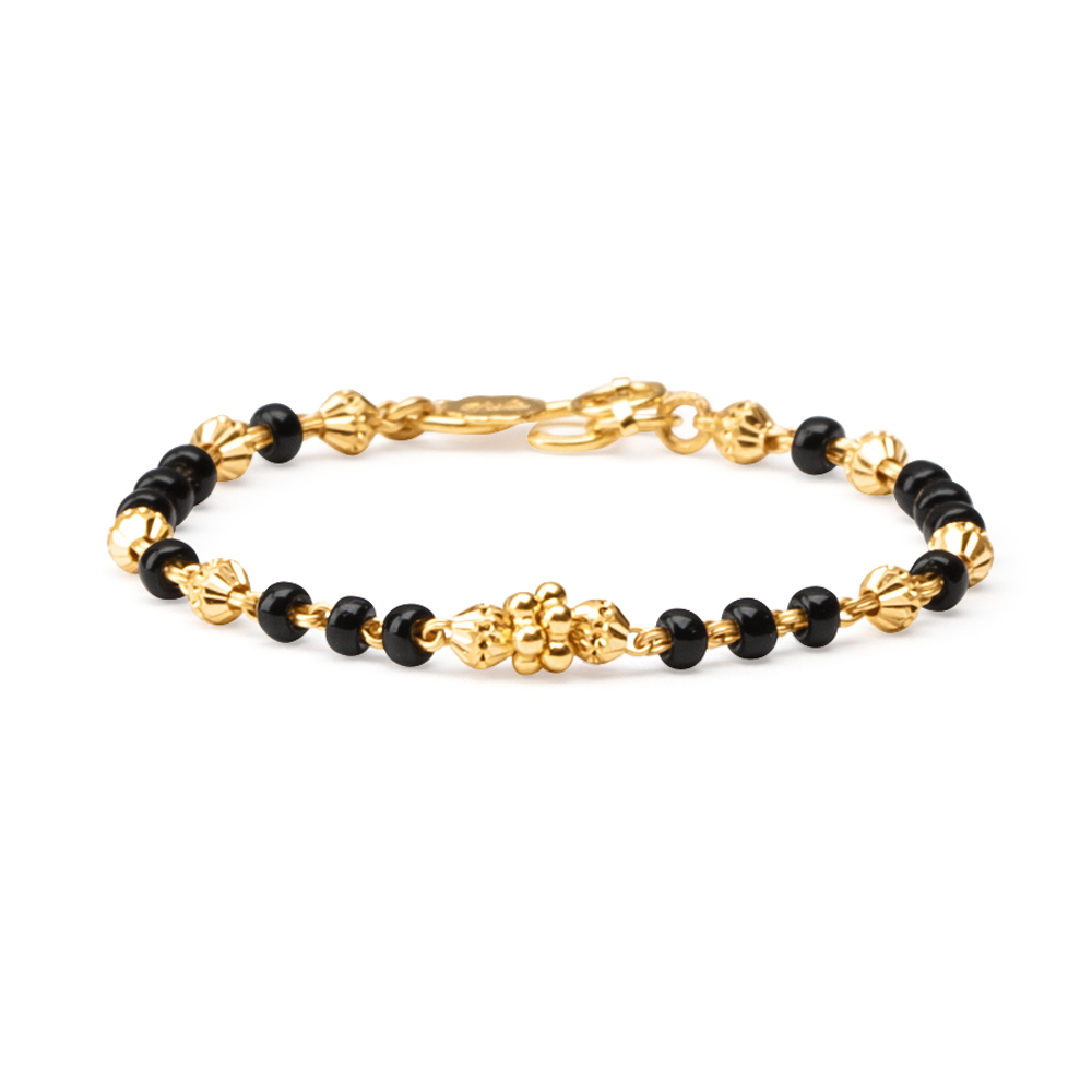 يجمع سوار الأطفال هذا المصنوع من الذهب عيار 22 قيراطًا المصنوع بشكل جميل بين التقاليد الخالدة والتصميم الرقيق، مما يجعله قطعة مثالية للرضع والأطفال الصغار. يتميز السوار بعناصر ذهبية مصقولة بالتناوب مع خرزات سوداء كلاسيكية ترمز إلى الحماية والتراث الثقافي.