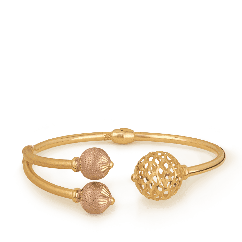 يتميز هذا السوار بتصميم السوار المنفصل الجذاب المصنوع من الذهب الأصفر الفاخر عيار 22 قيراط. ويتميز بتباين مميز مع أغطية خرز وردية ناعمة غير لامعة على أحد طرفي السوار وحلية مزخرفة مخرمة جميلة على الطرف الآخر، مما يوفر توازناً بين الهيكل والمرح.