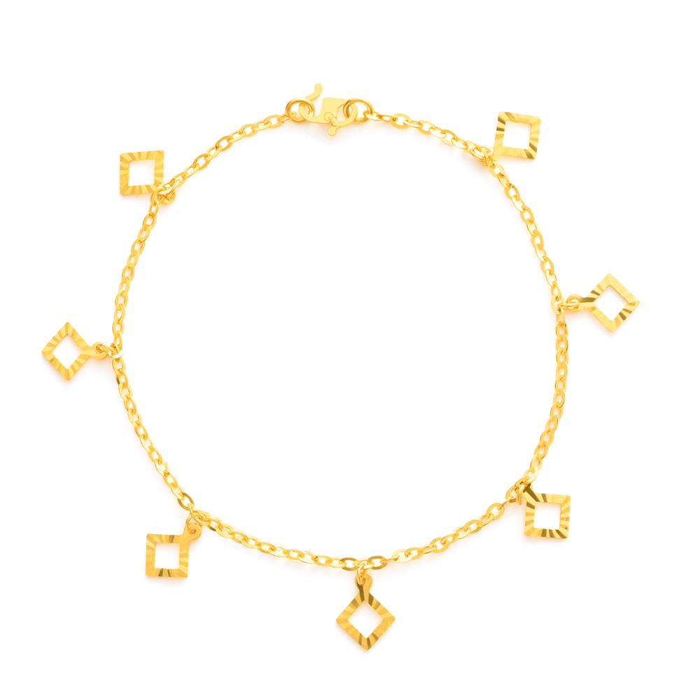 صُمم هذا السوار الساحر بزخارف متدلية تضفي حركة ولمعاناً على هيكله المشع من الذهب عيار 22 قيراطاً. خفيف على المعصم وغني بالتفاصيل ويعكس روحاً مبهجة مثالية للتنسيق اليومي الفريد أو الإهداء النابع من القلب. حائز على علامة مميزة في المملكة المتحدة لضمان النقاء والأصالة.