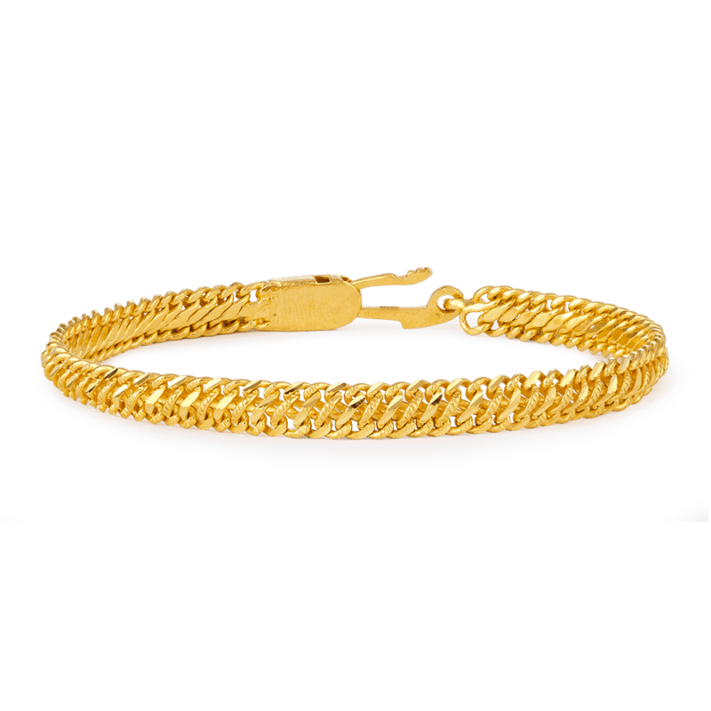 صُمم هذا السوار الرجالي المصنوع من الذهب عيار 22 قيراطًا كقطعة كلاسيكية جريئة وجريئة ومصممة حول تصميم رابط كبير على شكل حلقة، مما يضفي طابعًا رجوليًا لا مثيل له. تبرز اللمسة النهائية الأنيقة المصقولة الأنيقة الضوء مع كل حركة، مما يمنحها حضوراً راقياً وقوياً في نفس الوقت على المعصم. يبلغ وزنها 21 جرامًا وطولها 8.5 بوصة، وتتميز بأبعادها التي تجعلها تبرز دون أن تشعر بأنها مبالغ فيها، مما يجعلها قطعة مميزة للاستخدام اليومي وكذلك قطعة مناسبة للمناسبات.
