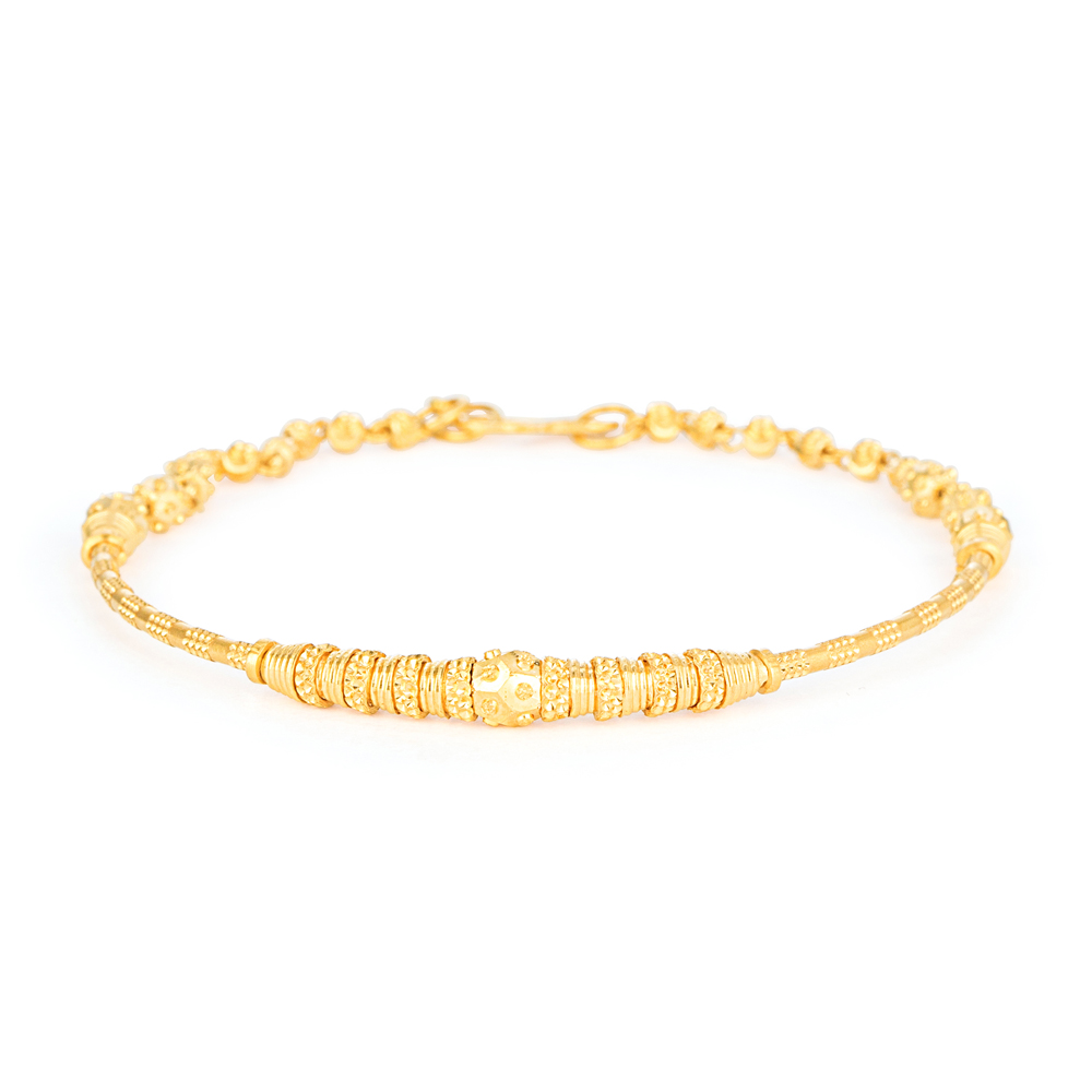 يتألف هذا السوار من سلسلة من الخرزات ذات الزخارف المعقدة التي تتمحور حول خرزة بؤرية أكبر قليلاً تجذب الأنظار. يخلق هذا الترتيب انسيابية إيقاعية، حيث يضيف كل عنصر تنوعاً في السطح والشكل. يحافظ شكلها الرفيع على دقة القطعة مع السماح للتفاصيل بأن تظل معبرة وملموسة.