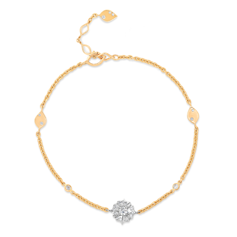 صُنع سوار Bloom Dew Drop المصنوع يدوياً في لندن، وهو عبارة عن تركيبة متناغمة من ذهب بيورجوولز الحصري من عيار 22 قيراطاً من ذهب صن رايز عيار 22 قيراطاً والبلاتين. وفي وسط السوار هالة بلاتينية أنيقة من بتلات اللوتس المنحوتة - متموجة وجذابة للضوء ومفصلة بشكل معقد من الأمام والخلف - تحتضن لحظة التفتح الكامل. تضفي هذه التركيبة المعدنية المزدوجة تبايناً ووضوحاً، حيث يبرز البلاتين نقاء الشكل، بينما يشع الذهب المحيط به دفئاً. صُنعت السلسلة من إيقاع رشيق من الألماس المرصع بالمناظر وبتلات مجموعة قطرة الندى، مما يخلق إحساساً بالحركة واللمعان. يضفي ترصيع قطرة الندى الذي تشتهر به بيورجويلز تألقاً ناعماً ولامعاً في جميع أنحاء السوار. ويكتمل السوار بإبزيم على شكل بتلة اللوتس وسلسلة ممتدة على شكل بتلة وعلامة مميزة على شكل بتلة على شكل بتلة الندى، وكل تفصيل من هذه التفاصيل مدروس ومنحوت وغارق في الجمال الرمزي.