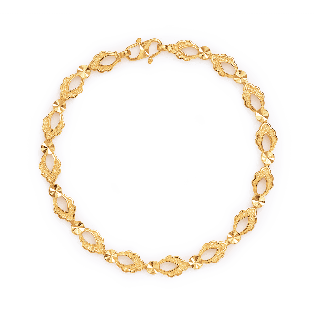 هذا سوار يتميز بنمط انسيابي من أشكال أوراق الشجر مع عناصر مصقولة رقيقة مصقولة لإضفاء مظهر أنثوي أنيق. مصنوع من 22 قيراط ذهبي ينسدل بنعومة حول المعصم ليوفر الراحة والتألق الأنيق طوال اليوم. تم تصميمه بعلامة مميزة في المملكة المتحدة وهو احتفال جميل بتصميم مستوحى من الطبيعة ويشكل تذكاراً رائعاً للاحتفال بالمناسبات الخاصة.