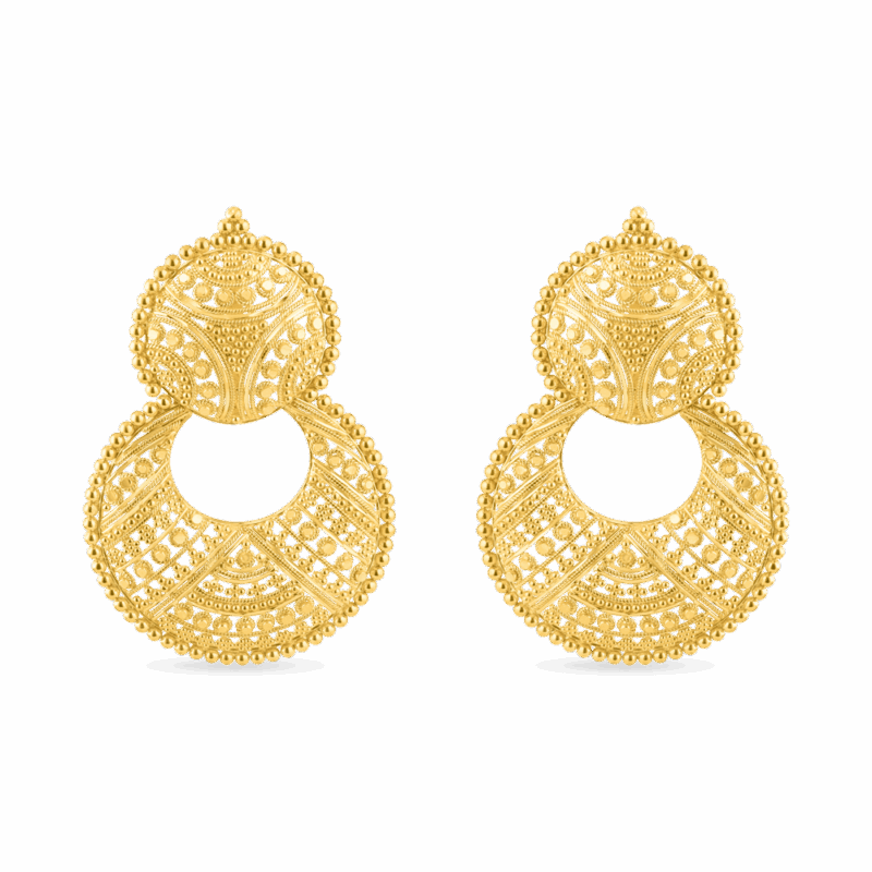 زيّني أذنيك بأناقة ملكيّة مع قرط فيليغري تشاند بالي من الذهب عيار 22 قيراط، وهو دليل حقيقي على المجوهرات الهندية التراثية. صُنعت هذه الأقراط على شكل هلال بخبرة يدوية من الذهب عيار 22 قيراط، وتتميز هذه الأقراط الهلالية الشكل بزخارف معقدة تعكس الحرفية التقليدية مع تصميم عصري. وهي مثالية لحفلات الزفاف والمناسبات الاحتفالية أو إهداء الإرث فهي مثالية لمحبي أقراط شاند بالي ومجوهرات الزفاف الهندية والقطع الذهبية المصنوعة يدوياً من عيار 22 قيراطاً.