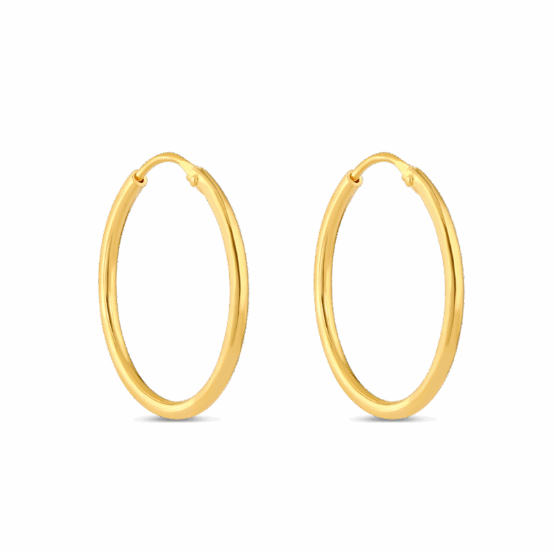 أقراط دائرية أنيقة من الذهب عيار 22 قيراطاً بلمسة نهائية ناعمة عالية اللمعان وقطر داخلي 22 ملم. مثاليان للارتداء اليومي أو للتنسيق في طبقات.