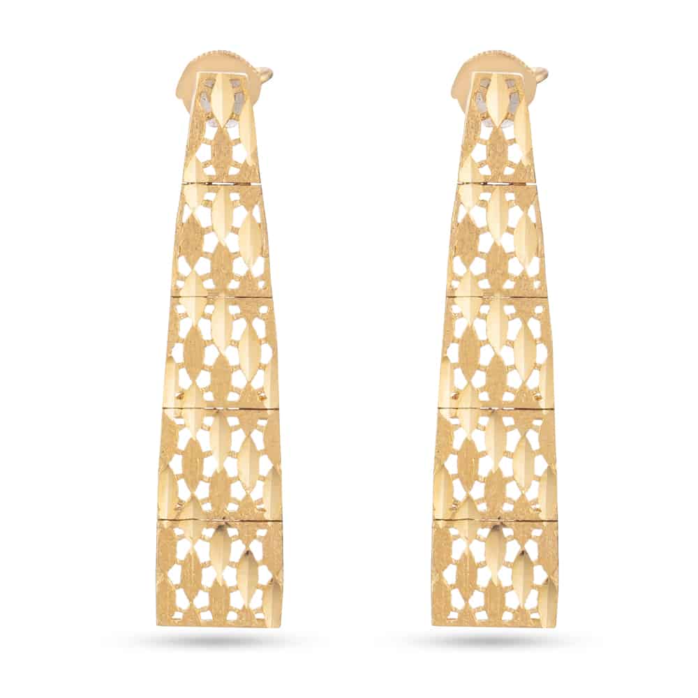 تتميز هذه الأقراط المتدلية المصنوعة من الذهب عيار 22 قيراطًا بنمط هندسي عصري مقصوص بشكل معقد في تصميم مستدق يطيل الشكل بشكل رشيق. صُنع كل جزء من القرط بدقة متناهية ليعكس الضوء ببراعة ويخلق جاذبية بصرية.