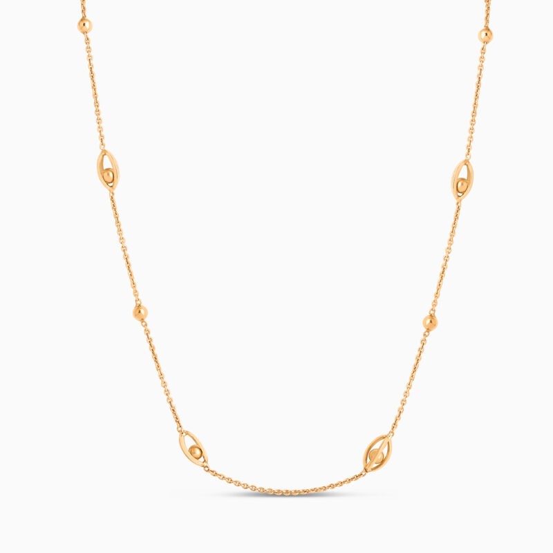 يتميز سلسال إلتشي من الذهب عيار 22 قيراطاً من الذهب بزخارف كبسولة رقيقة مستوحاة من دفء حبات الهيل، متباعدة على طول سلسلة ذهبية رفيعة. كما تتميز بتفاصيلها الراقية وتوهجها الناعم مما يجعلها قطعة مركزية أنيقة لطقم مجوهرات العيد. مثالي لوضعه في طبقات أو تنسيقه مع قطع متناسقة لإطلالة احتفالية كاملة.