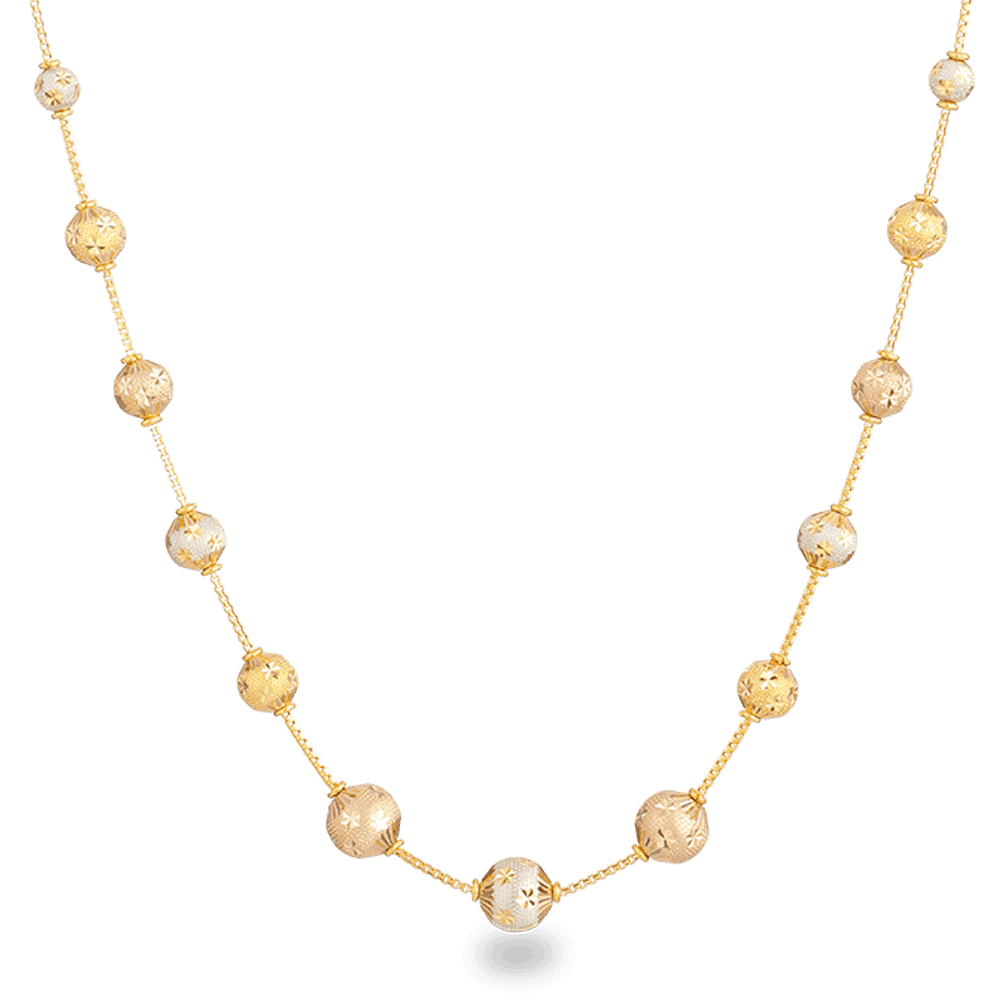 تتميز هذه القلادة بتسلسل إيقاعي من الخرز الكروي الأوجه المتباعدة بالتساوي على طول سلسلة ذهبية رفيعة. تم تشطيب بعض الخرزات المختارة بالروديوم الذهبي الوردي، مما يضفي تبايناً لونياً لطيفاً يخفف من المظهر العام ويضيف اهتماماً بصرياً هادئاً. التصميم متوازن وانسيابي وبسيط عن قصد.