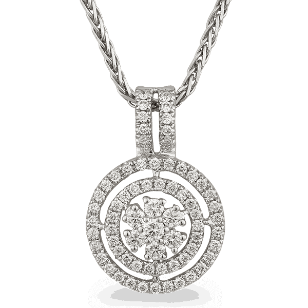 استمتع بتألق التصميم الخالد مع هذا التصميم ذهب أبيض عيار 18 قيراط قلادة ألماس. يكمن في قلبها عنقود من الألماس مصمم بشكل جميل يرمز إلى الأناقة والأنوثة. يحيط بالزخرفة المركزية المعقدة هالة مزدوجة من الألماس المبهر، مما يزيد من بريقها وجاذبيتها.