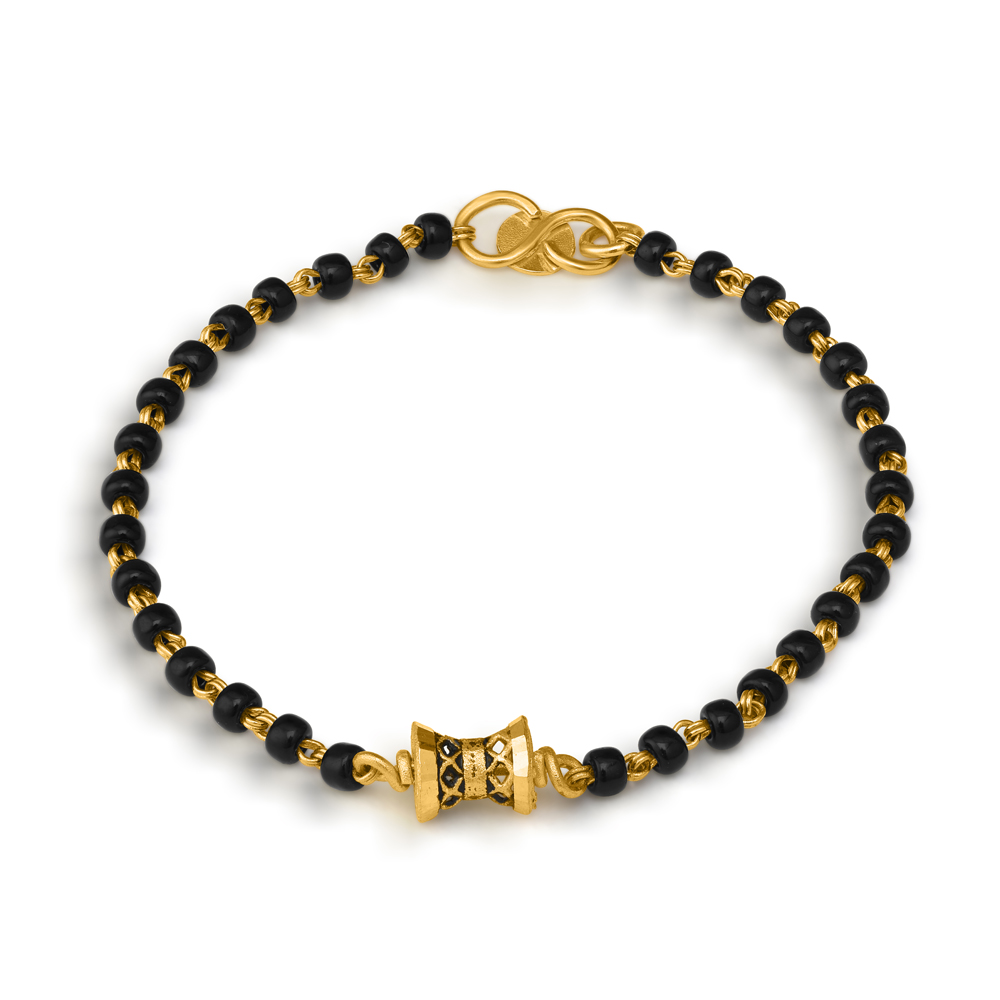 Dieses Babyarmband zeigt ein fein strukturiertes goldenes Mittelmotiv, das von einer klassischen Reihe schwarzer Perlen eingerahmt wird. Der Kontrast zwischen dem warmen Schimmer des 22-karätigen Goldes und dem tiefen Ton der Perlen sorgt für einen zeitlosen, unaufdringlichen Look. Mit seinen sanften Proportionen sitzt das Armband bequem am Handgelenk des Babys, ohne schwer oder aufdringlich zu wirken.