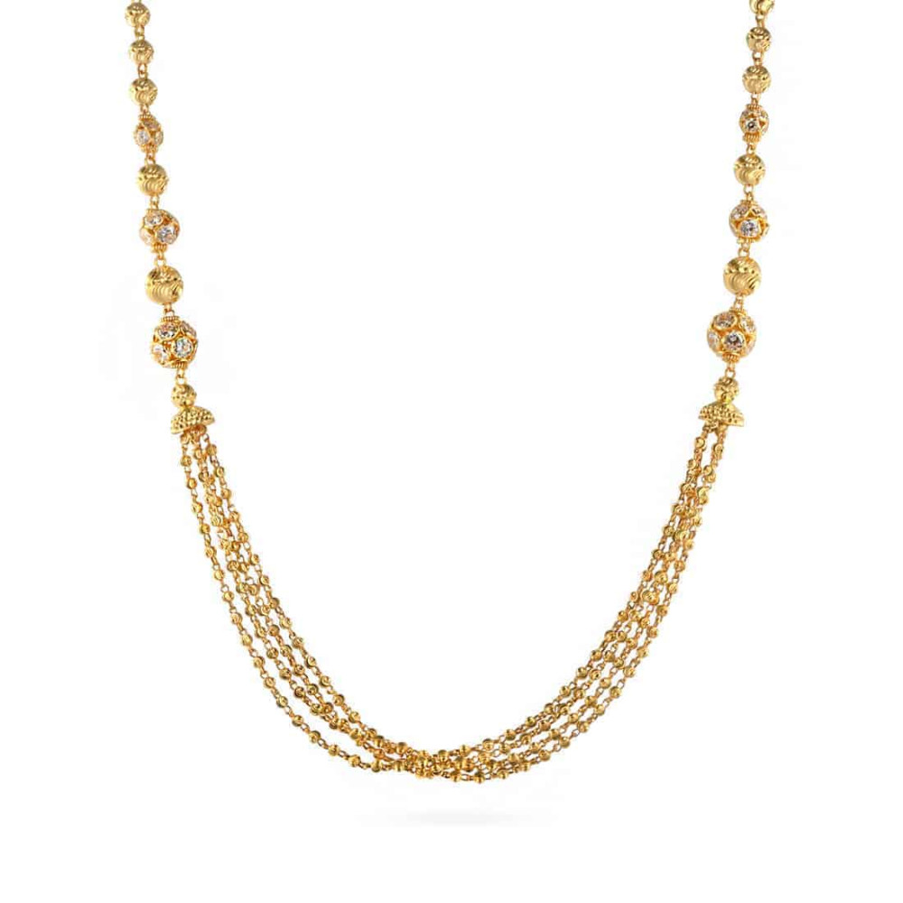 Veredeln Sie Ihr Brautensemble mit der Opulenz der Tradition und zeitloser Handwerkskunst. Diese 22-karätige Gold-Mehrfachkette Halskette für Bräute ist exquisit gestaltet mit kunstvollen Details und verfügt über eine Reihe handgefertigter Goldperlen, die mit funkelnden Zirkonia-Akzenten durchsetzt sind.