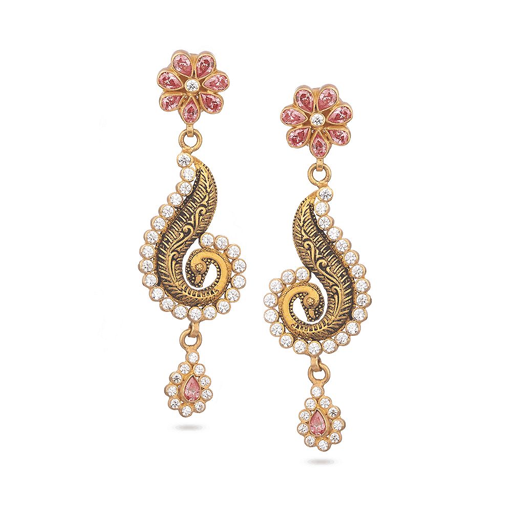 Inspiriert von der zeitlosen Eleganz des indischen Erbes, das Floral Paisley Ohrringe Zwei ikonische Motive verschmelzen miteinander – der Paisley-Wirbel, der Leben und Fruchtbarkeit symbolisiert, und eine zarte Blüte. Akzentuiert durch naturalistische Kurven und tropfenförmige Polki-Akzente ist das Design eine Hommage an die klassischen Traditionen des Mogul-Schmucks.