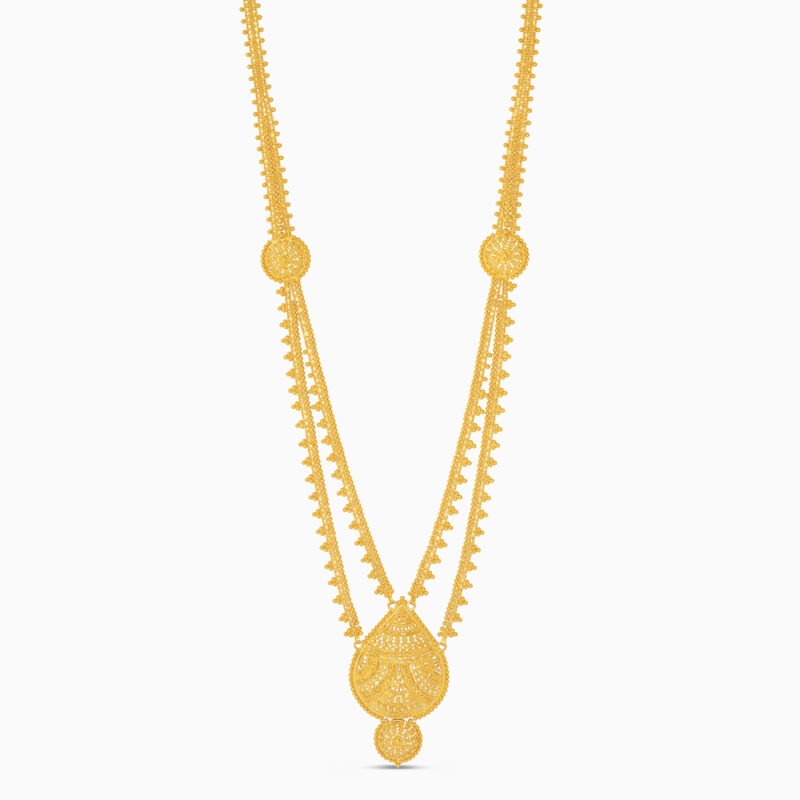Dieses in Handarbeit aus luxuriösem 22-karätigem Gold gefertigte Schmuckstück ist ein Meisterwerk der Filigrantechnik - eine uralte Technik, bei der feine Golddrähte aufwändig geformt und verschmolzen werden, um spitzenartige Muster zu schaffen. Jedes Element wird sorgfältig zusammengesetzt, um Präzision, Langlebigkeit und eine luftige Eleganz trotz seines reichen Aussehens zu gewährleisten.