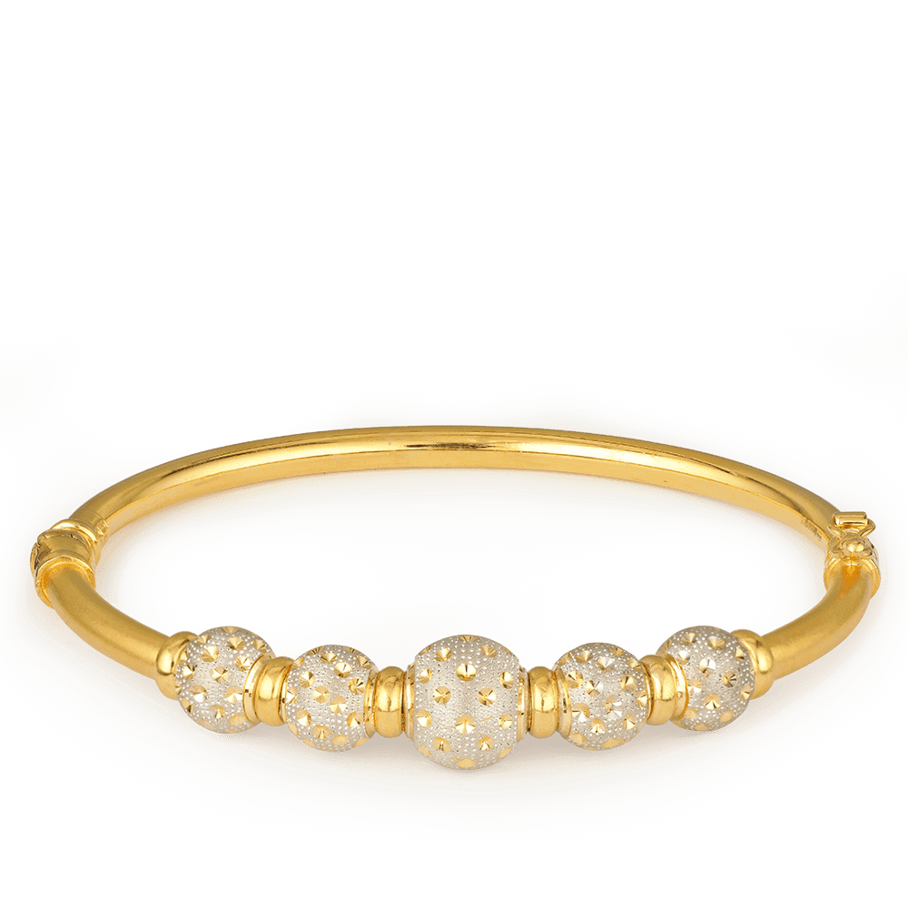 Dieses Schmuckstück besteht aus einem glatten Goldband, das in der Mitte von einer Reihe kugelförmiger Perlen akzentuiert wird. Jede Perle hat eine strukturierte Oberfläche mit rhodinierten Highlights, die ein subtiles Spiel von Licht und Ton erzeugen. Die Komposition ist durch Symmetrie ausgeglichen, wobei kleinere goldene Abstandshalter die einzelnen Elemente voneinander abgrenzen.
