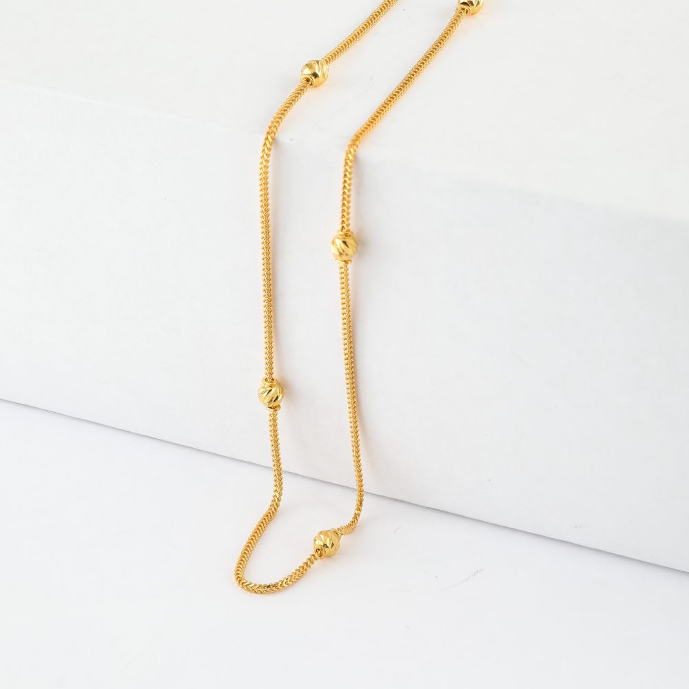 Die sorgfältig aus 22-karätigem Gold gefertigte und im Vereinigten Königreich gepunzte Fuchsschwanz-Struktur bietet Festigkeit und Geschmeidigkeit, während die präzise gefassten Perlen für Gleichgewicht und Bewegung sorgen. Das Ergebnis ist eine leichte Kette, die sowohl schön als auch langlebig ist.