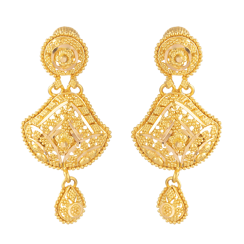 Diese wunderschönen Ohrringe sind eine Hommage an die zeitlose Kunst der Jali-Filigranarbeit. Mit ihrem mehrschichtigen Tropfendesign betonen die Ohrringe symmetrische Jali-Muster, die von zarten Blumenbordüren umgeben sind. Der untere Anhänger sorgt für Bewegung und verstärkt die visuelle Tiefe, wodurch sie zu einem wahren Schmuckstück voller Anmut werden.