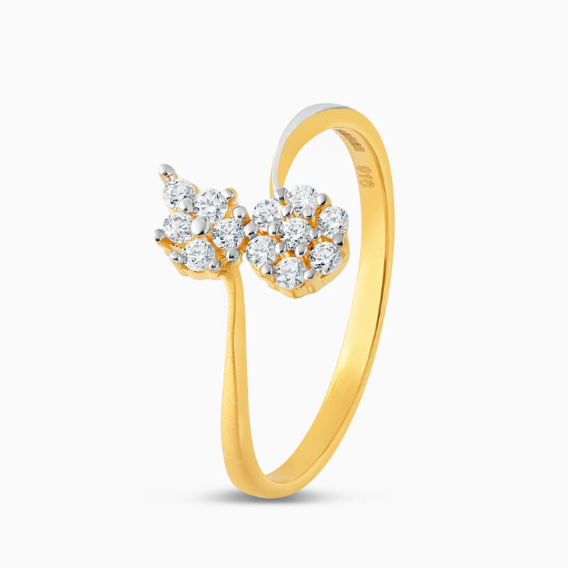 Dieser elegante Ring aus 22 Karat Gold zeigt zwei florale CZ-Cluster, die wie strahlende Blüten glitzern. Das offene Design sorgt für Bewegung und Balance und symbolisiert Harmonie und die Schönheit der Verbindung.