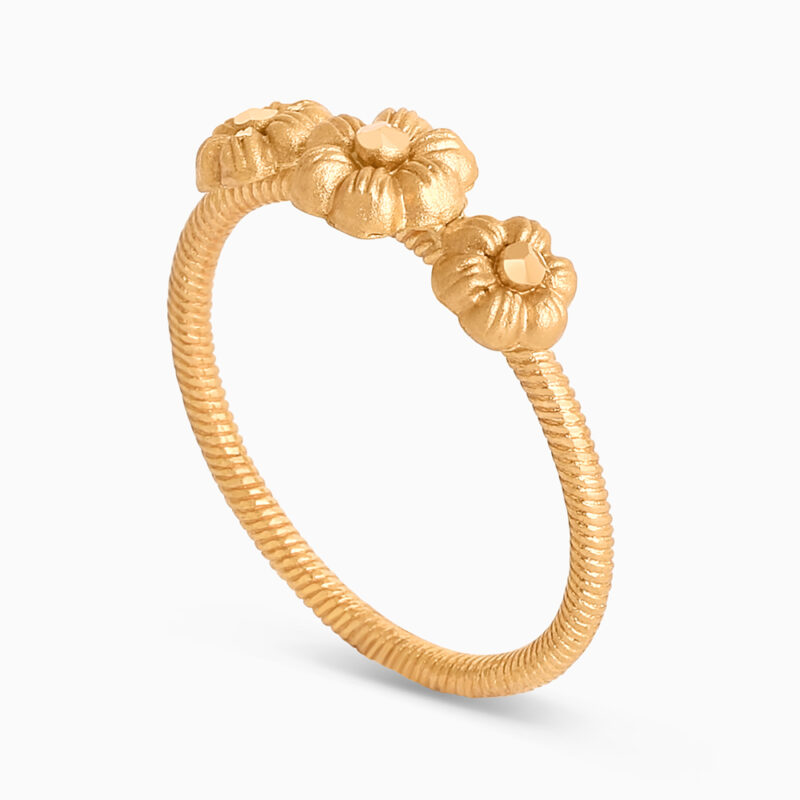 Der Rosette Bloom Ring zelebriert das Geschichtenerzählen durch Design und zeigt ein Blütentrio - eine 6 mm große Rosette in der Mitte, flankiert von zwei 5 mm großen Seitenmotiven. Das Arrangement aus 22-karätigem Sunrise Gold sorgt für ein anmutiges Gleichgewicht der Formen, wobei die polierten Zentren mit den strukturierten Blütenblättern für zusätzliche Tiefe sorgen.