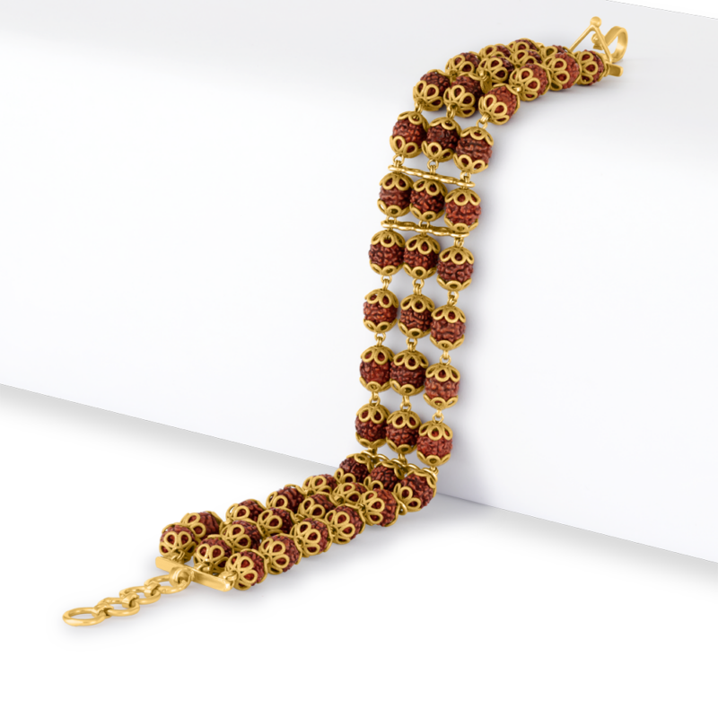 Erhöhen Sie Ihren Stil und Ihre spirituelle Verbindung mit diesem atemberaubenden 22ct Gold Rudraksh Drei-Linien-Armband. Dieses exquisite Armband aus reinem 22-karätigem Gold besteht aus drei Reihen heiliger Rudraksh-Perlen, die akribisch angeordnet sind, um einen kühnen und doch raffinierten Look zu kreieren. Die für ihre spirituelle Bedeutung verehrten Rudraksh-Perlen sollen dem Träger Frieden, Harmonie und Schutz bringen. Damit ist dieses Armband sowohl ein modisches Statement als auch ein Symbol für innere Stärke.