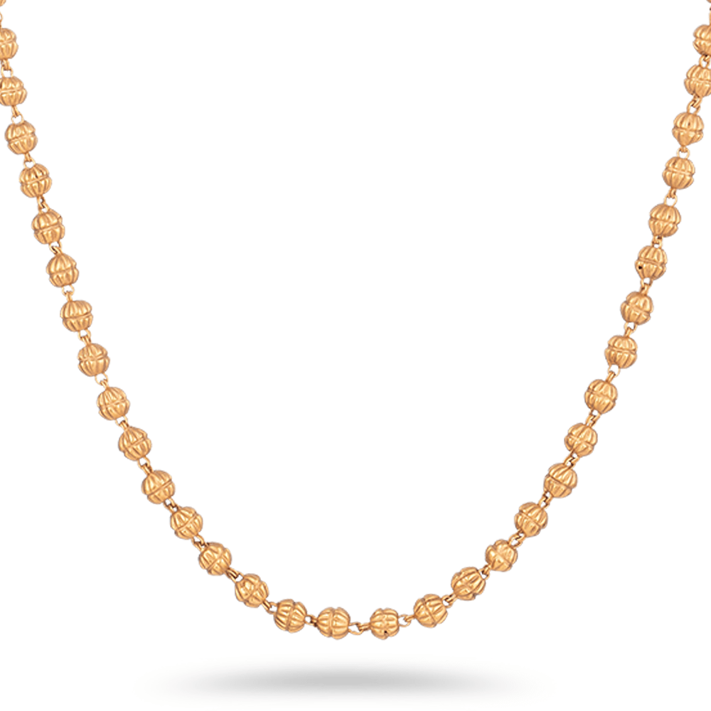 Diese besondere Gold-Kügelchen Kette Design von Purejewels ist wunderschön von Hand von Grund auf von unseren Karigars in Indien gefertigt. Jede ausgefallene Perle in der Kette wurde aus reinem 22K Gold geschnitzt und weiter von Hand gemeißelt, um traditionelle Lotus-aussehende Muster um sie herum zu schaffen und weiter zart durch handgeschlagene Drähte verbunden, um diese schöne Halskette zu bilden. Stylen Sie diese Brautkette lässig mit Ihren Western, Kurtas oder Saris an festlichen Tagen, oder legen Sie sie sogar mit traditionellen schweren Halsketten zu Anlässen übereinander, während Sie sich schön in Ihrem traditionellen Kleid kleiden. Sie können auch mehrere Anusha-Halsketten aus 22 Karat Gold übereinander legen und so eine dramatische
