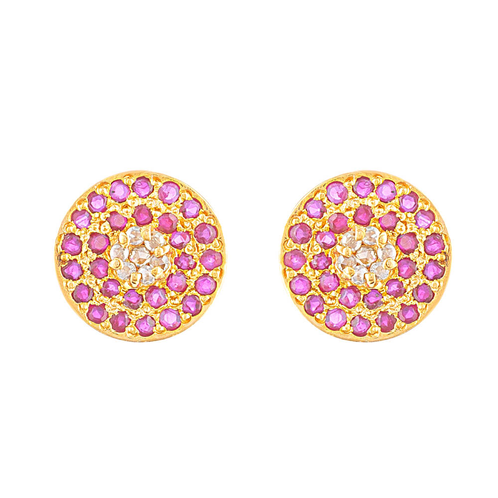 Diese eleganten Ohrstecker sind aus 22 Karat Gold handgefertigt und verfügen über eine zentrale Anordnung von ungeschliffenen Polki Diamanten, umrahmt von einem Ring aus rosafarbenen Edelsteinen, die alle sorgfältig von Hand gefasst wurden. Die Komposition ist kompakt und dennoch auffällig – sie verbindet den Charme der alten Welt mit raffinierten Details. Die offene Polki-Fassung lässt natürliches Licht einfallen, wodurch jeder Diamant noch mehr strahlt, und die Medaillonform wird durch einen polierten Goldrand abgerundet, der für zeitlose Eleganz sorgt. Getreu der Tradition von PureJewels zeugt jedes Detail von traditioneller Handwerkskunst und durchdachter Kunstfertigkeit.