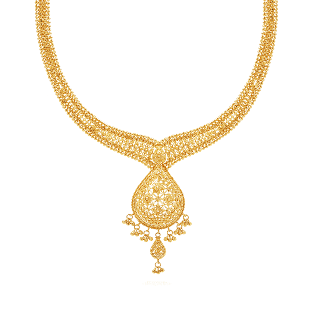 Die Jali Teardrop Filigree Halskette aus 22 Karat Gold verfügt über einen reich strukturierten Kragen, der in einen kunstvollen Tropfenanhänger übergeht. Feine Gitterarbeiten, Blumenmotive und granulierte Details bilden mehrere Musterebenen, die mit winzigen Perlen im Ghungroo-Stil abgerundet werden, die dem Ausschnitt eine sanfte Bewegung verleihen.