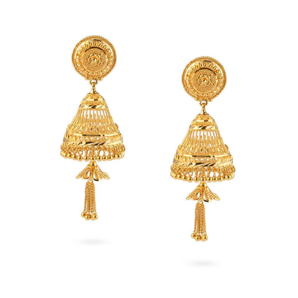 Anmutig gefertigt aus reinem 22ct Diese Cutwork Jali Ohrringe aus Gold sind eine strahlende Hommage an traditionelle Handwerkskunst. Inspiriert von den kunstvollen Gitterwerken der königlichen indischen Architektur, verfügt jeder Ohrring über filigrane Jali-Cutwork-Verzierungen, die zu einer eleganten Glockenform geformt sind. Das Design hängt an aufwendig gearbeiteten runden Ohrsteckern und geht in eine verspielte Franse und eine fein gearbeitete Quaste über, die für Bewegung und Charme sorgen.