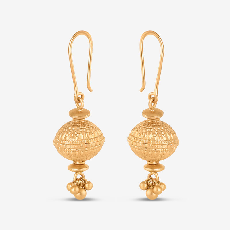 Strahlen Sie mit unserem Sonnenaufgangskugel 22ct Gold TropfenohrringeEine anmutige Mischung aus Tradition und Raffinesse. Diese aus reichhaltigem 22-karätigem Gelbgold gefertigten Ohrringe zeigen einen fein strukturierten kugelförmigen Tropfen, der an einem polierten Fischhakendraht aufgehängt ist. Akzentuiert mit zierlichen goldenen Gungroos an der Basis, evozieren sie den Charme der klassischen indischen Ästhetik.