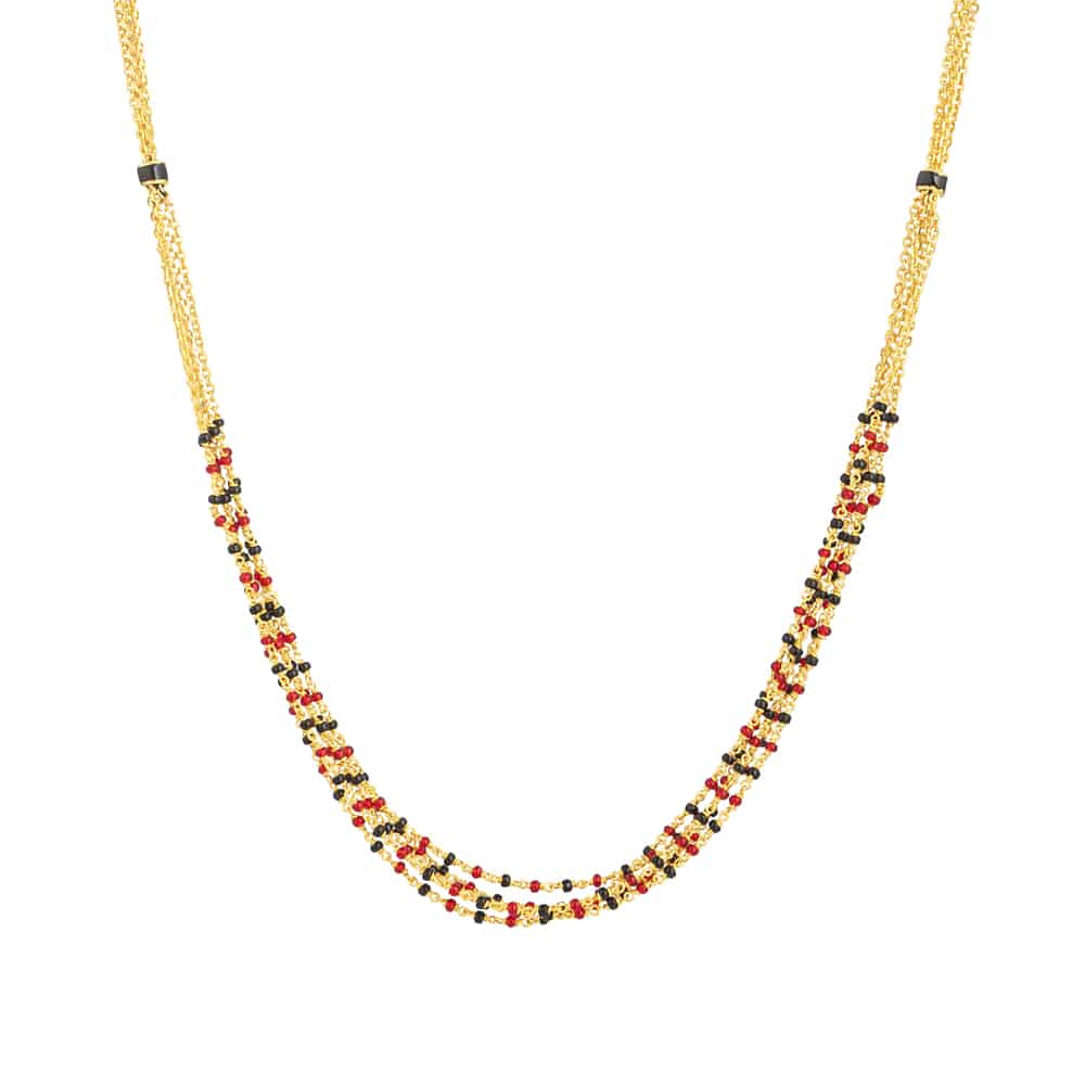 Diese mangalsutra besteht aus einem Doppelstrang, der traditionelle schwarze Perlen mit subtilen roten Akzenten kombiniert, die für zusätzliche Tiefe sorgen. Die mehrschichtige Struktur sorgt für einen anmutigen Faltenwurf, während die ausgewogene Anordnung der Farben für Rhythmus und visuelles Interesse sorgt. Das Design verbindet die traditionelle Symbolik mit einer raffinierten und modernen Silhouette.