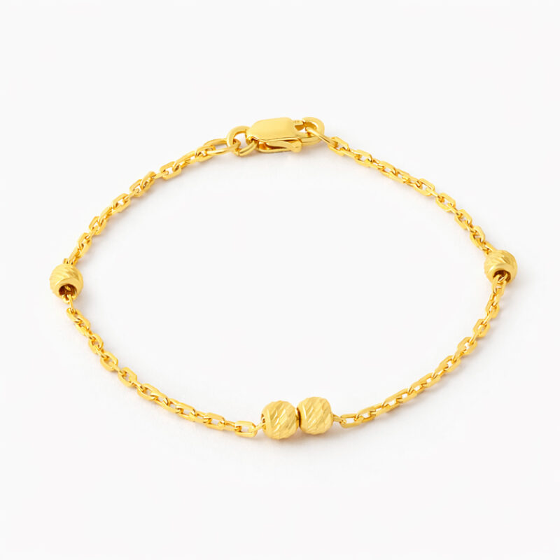 Handcrafted in 22ct yellow gold, this bracelet is meticulously designed with soft-edged textured beads that are both safe and stylish for baby wear. Measuring 5 inches and weighing 1.4 grams, it is perfectly sized for little wrists. Hallmarked by the London Assay Office, it promises authenticity and heirloom quality.