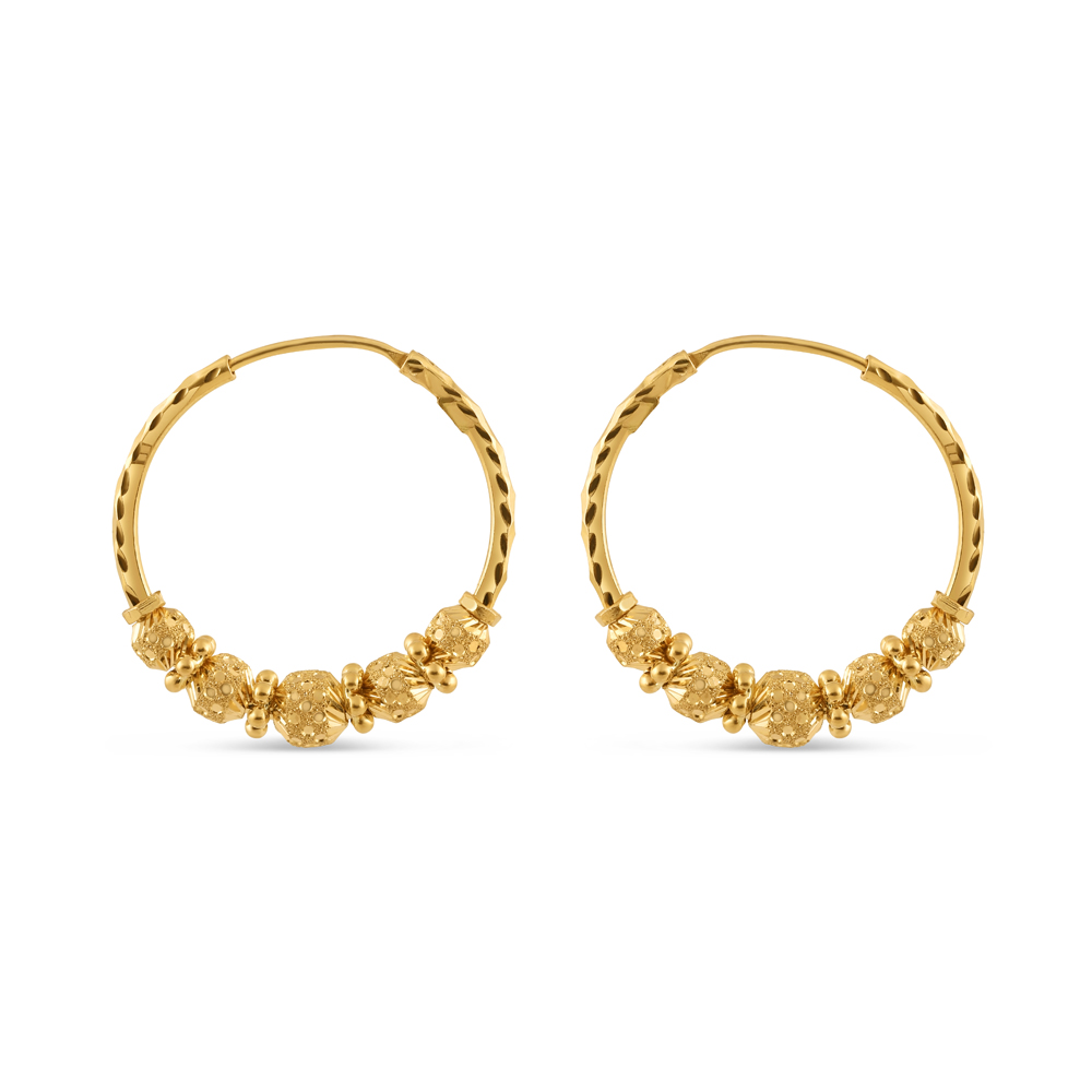 Add a touch of elegance to any outfit with these 22ct gold beaded hoop earrings. Crafted from high–quality gold, these earrings are designed to last. The beaded detailing adds a touch of luxury, while the hoop design ensures they are easy to wear. Whether you are dressing up for a special occasion or simply want to add a little something extra to your everyday look, these earrings are a great choice.