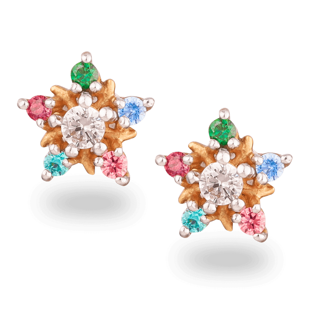 The CZ Star Earrings are a joyful expression of sparkle and colour. At the centre sits a brilliant round-cut CZ stone, radiating with diamond-like clarity. Surrounding it, finely set coloured CZ stones in shades of pink, green, turquoise, and blue form a starburst rosette — playful, vibrant, and timeless.