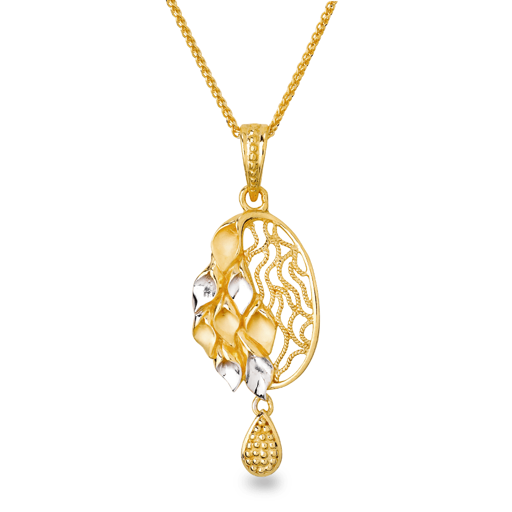 Handcrafted in 22ct yellow gold, the pendant highlights rhodium-plated accents on the leaf details, adding a contrasting shimmer. The delicate filigree-style latticework on one side enhances depth and showcases skilled goldsmith artistry.