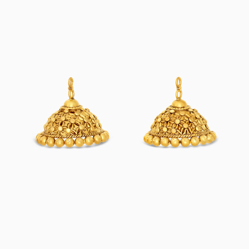 Complete your look with the Armari 22ct Gold Jhumkha Droppers, expertly crafted to pair seamlessly with detachable earring tops or studs. Designed in a classic dome shape, each dropper is adorned with raised petal-like textures across the surface, bordered by a delicate rope pattern and finished with a beaded granule edge.