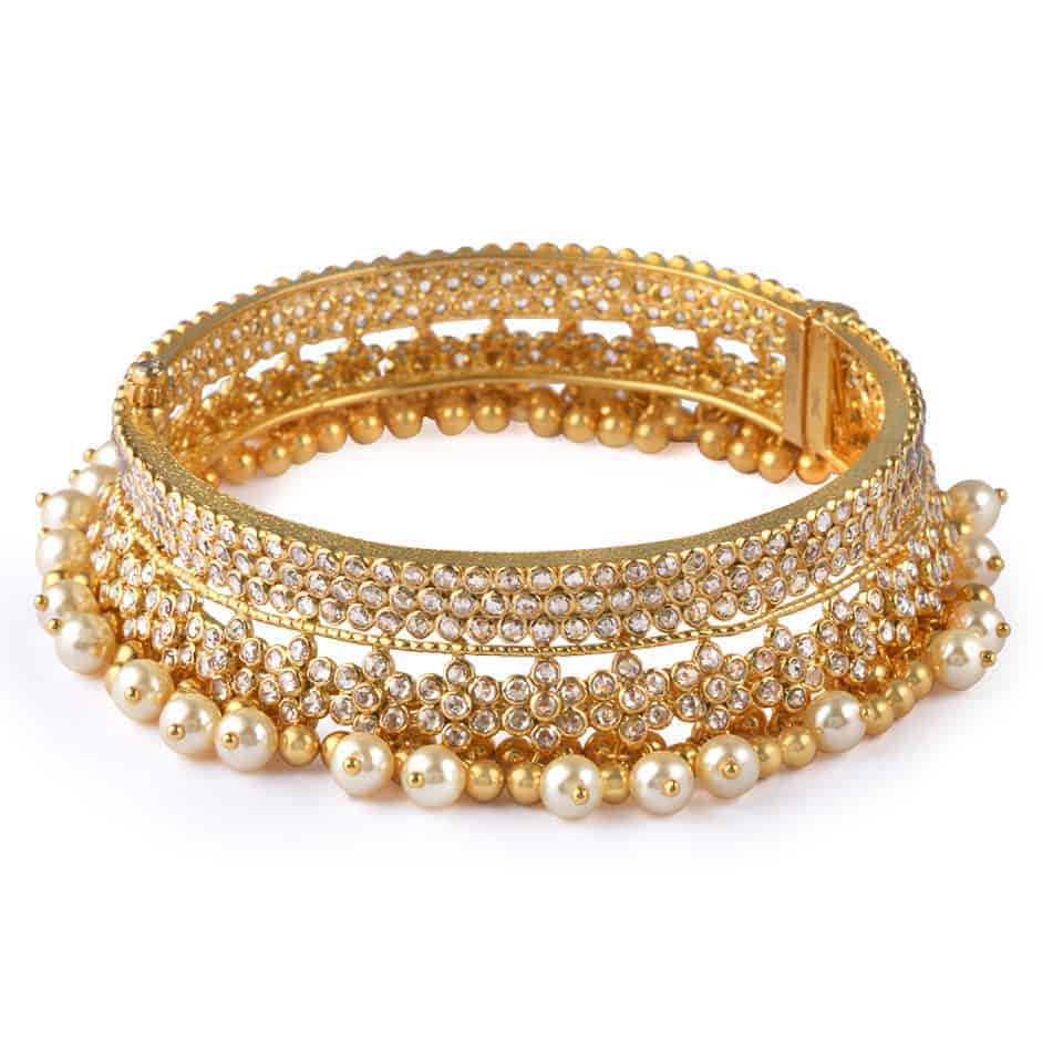 - Kada with 10.53 carats Rosecut Polki diamonds with Pearls and Gold droplets