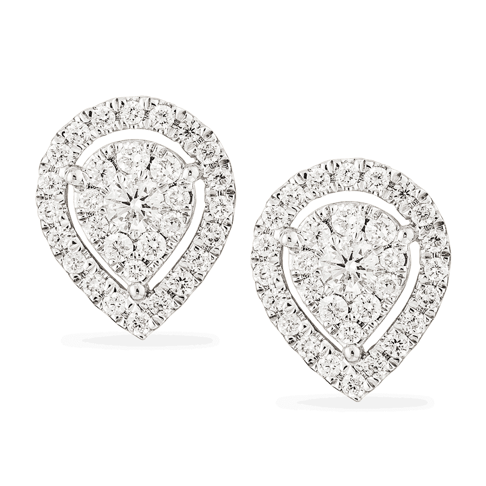 Yumuşak armut biçimli siluetiyle zarifçe şekillendirilmiş bu pırlanta küpeler, daha fazla parlaklık için narin bir çift hale ile çerçevelenmiştir. Işıltılı beyaz altından üretilen tasarım, ışıltı ve yapının zarif bir etkileşimini sunar; hem günlük kullanım hem de özel anları abartısız bir lüksle yükseltmek için mükemmeldir.