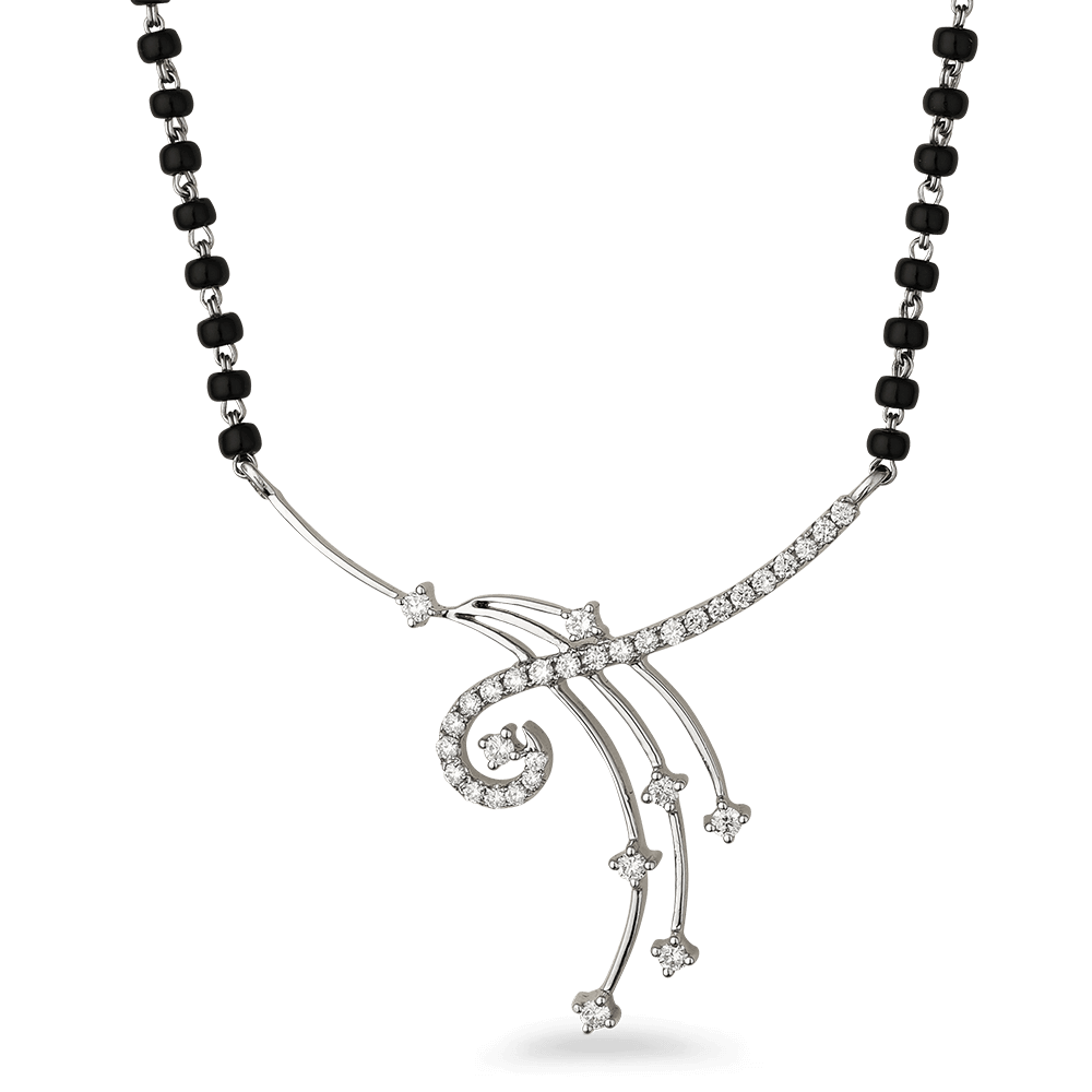 Geleneksel bir altın aranıyor elmas mangalsutra şık ve modern bir görünümle? Dileğiniz bizim için emirdir. Bu yıldız-duş kolye ucu 18 ayar beyaz altın ve elmaslarla aydınlatılmıştır. Klasik siyah boncuklarla zarif ve şık bir kontrast oluşturur. mangalsutra. Geniş çizgiler ve negatif boşlukla tasarlanan bu zarif altın pırlanta mangalsutra kolye ucu hafif ve rahattır. Şık ve modern gelinler için tek kelimeyle mükemmel.