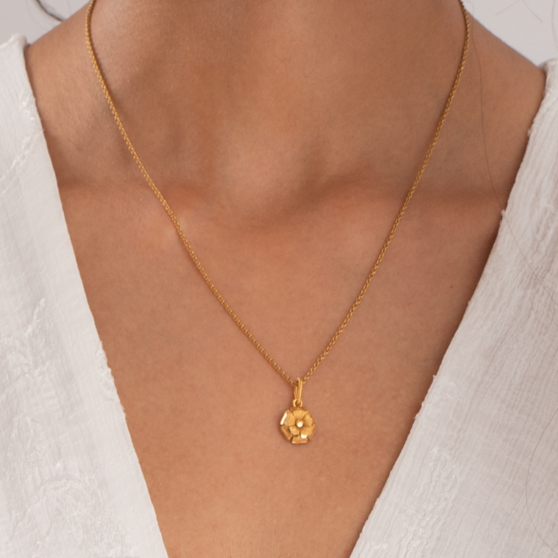Yüksek saflıkta 22 ayar gün doğumu altından ustalıkla üretilen kolye ucu, doku derinliğini ve parlaklığını vurgulayan özenle şekillendirilmiş yapraklara sahiptir. Her bir parça yetenekli kuyumculuğu ve detaylara gösterilen özeni yansıtmaktadır.