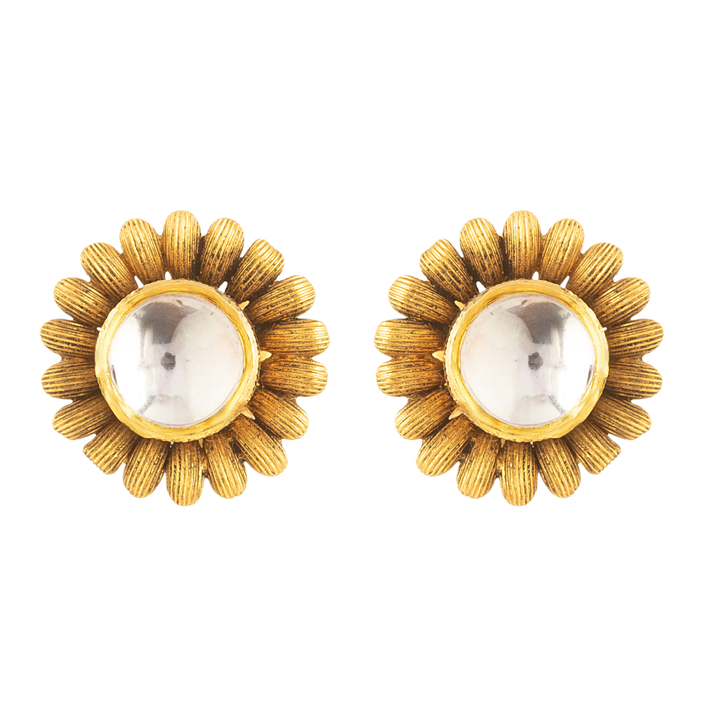 Cesur çiçek motifleriyle tasarlanan her bir küpe, ortasında tek bir cilalı kundan taşı barındırıyor. Bu taş, ince dokulu, yaprak benzeri altın detaylarla çevrili ve antika bir dokunuşla tamamlanmış. Işıldayan tasarım, açan kadife çiçeğinin ihtişamını çağrıştırıyor ve kültürel zarafete bağlı kalarak dikkat çeken bir parça haline geliyor.