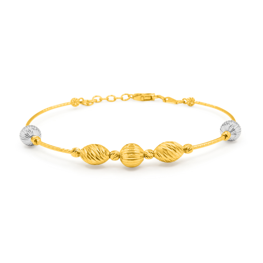 Bu 22K altın bilezik geleneksel olarak tasarlanan ince bilekliğin geliştirilmiş bir versiyonudur ve altın bileklik şeklinde üretilmiştir. Bilezik Kolay giyilebilirlik ve zahmetsizlik sağlamak için. Tasarım, tüm yüzeyi dokulu, incelikle işlenmiş altın bir kordonla başlıyor. Büyüleyici badem şeklindeki altın boncuklar, yüzleri boyunca elle yontulmuş ve bileziğin rakipsiz güzelliğini korurken zahmetsizce takılabilirliğini sağlamak için kordona ergonomik olarak stratejik konumlarda estetik bir şekilde bağlanmıştır. Purejewels'in bu bileklik bileziği, çok yönlülüğün yanı sıra zahmetsizlik de göz önünde bulundurularak tasarlanmıştır, bu nedenle rodyum kaplamanın ipuçlarıyla sessiz bir altın parlaklık verilmiş ve her zaman yeşil kalması sağlanmıştır.