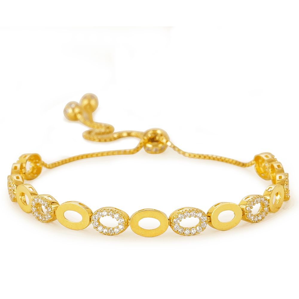 Özenle işlenmiş 22ct altın, bu Bilezik cilalı altın ve mikro ayar kübik zirkon süslemelerle dönüşümlü olarak sıralanan zarif oval şekilli açık boncukları sergiliyor. Oval şekillerdeki ışık ve doku etkileşimi, bu parçaya havadar ve modern bir zarafet katıyor.