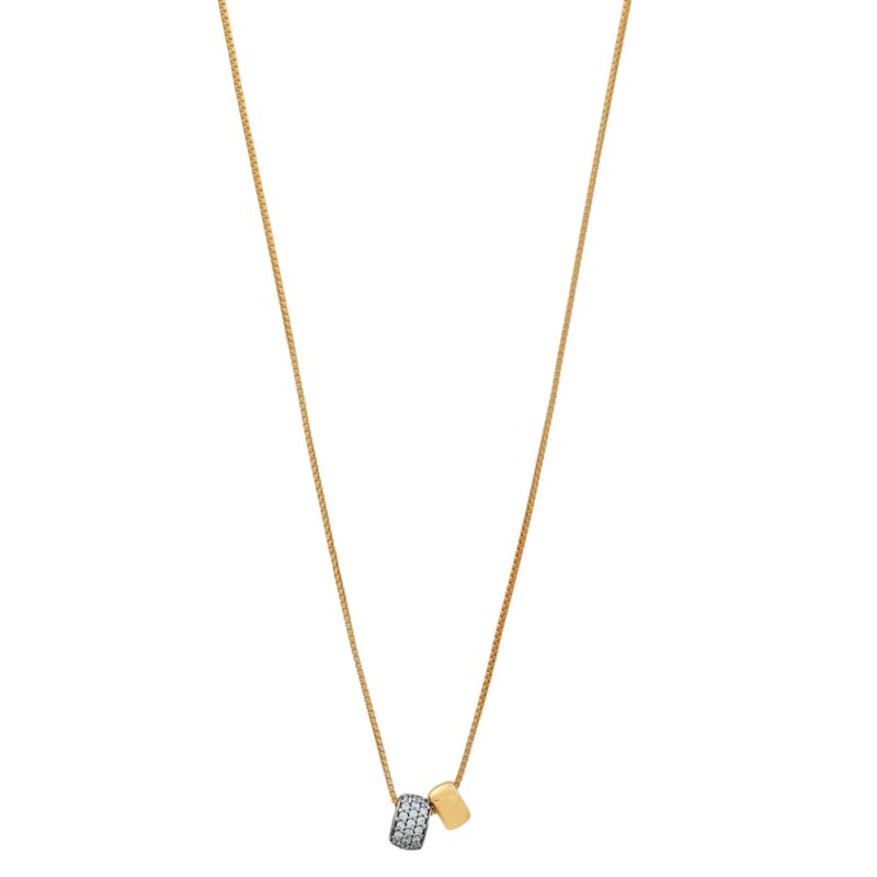 22 Ayar Altın Duo Charm CZ Kolye, minimalist şıklığı anlamlı bir tasarımla birleştiriyor. Biri ışıltılı CZ taşlarla, diğeri parlatılmış altınla süslenmiş iki farklı tılsım, ikiliği ve uyumu temsil eder. İnce bir altın zincir üzerinde asılı olan bu kolye, abartısız lüksü ve modern zarafeti yansıtıyor.