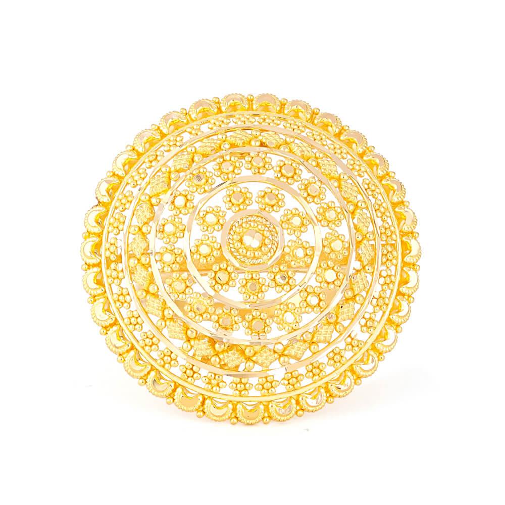 Yüksek saflıkta 22 ayar altından ustalıkla üretilen bu yüzük, karmaşık telkari ve granülasyon teknikleriyle olağanüstü bir sanat sergilemektedir. İnce altın unsurlar, denge ve simetriyi korumak için hassasiyet ve beceri gerektiren katmanlı eşmerkezli formlarda dikkatlice düzenlenmiştir. Cilalı ve dokulu yüzeylerin etkileşimi ışık yansımasını artırarak mandala tasarımına hayat verirken altının zenginliğini vurgular.