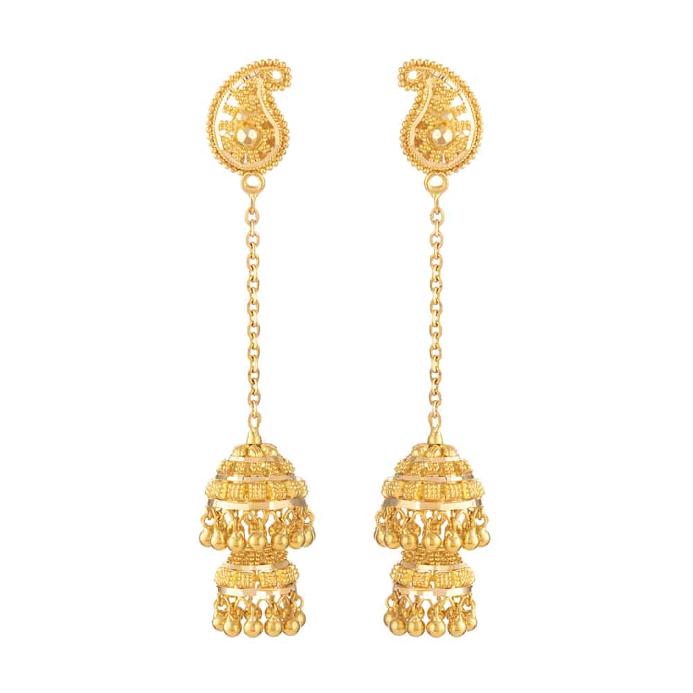 Bu küpeler, uzun ve zarif bir zincire bağlanan geleneksel paisley şekilli bir üst kısım ve güzel bir çift katmanlı jhumka (çan) motifiyle tasarlanmıştır. Her çandan sarkan altın küreler, parçanın akıcılığını ve hareketliliğini artırır. Paisley üst kısım, klasik unsurlar ve dramatik uzunluğun mükemmel bir karışımı olan, mirasın cazibesini yansıtan bir hava katar.