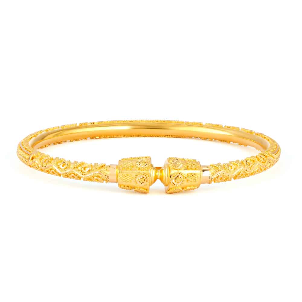 Bu zarif 22ct Altın bileklik, Hint sanatında derin kökleri olan geleneksel bir tasarımı sergiliyor. Bileklik, karmaşık telkari desenler ve zarif motiflerle süslenmiş olup, bileği zarif bir şekilde sarıyor. Yuvarlak uç detayları, simetri ve çekicilik katarak dekoratif cazibeyi zamansız bir estetikle harmanlıyor.